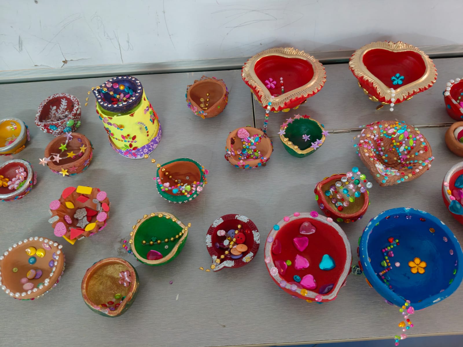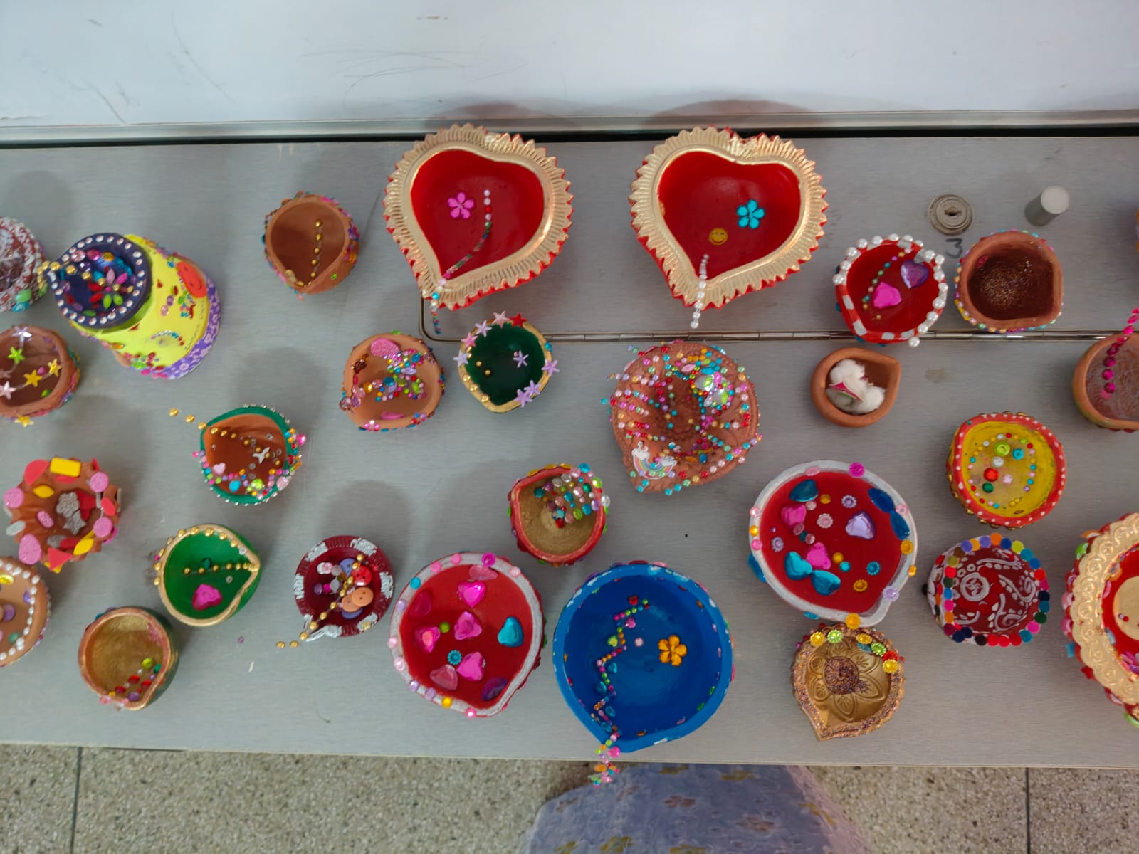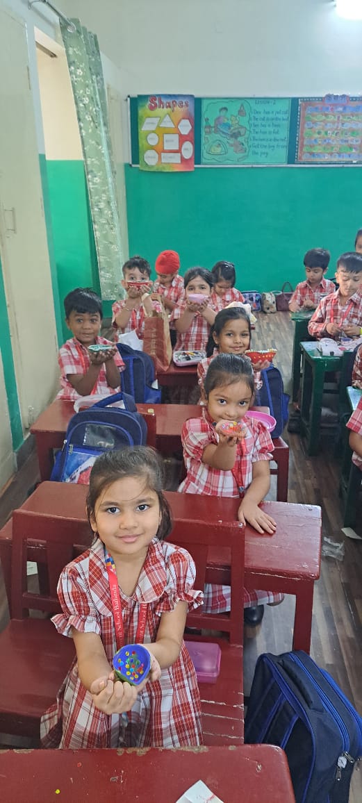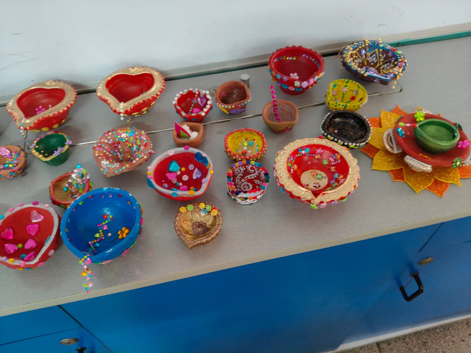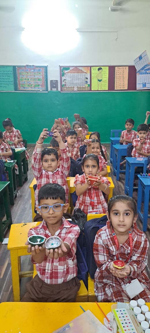 Diya Making Activity for Diwali was held for Class UKG on 8 Oct 2025. All the children were very happy and excited as they painted diyas with colors and added glitter and stickers. The diyas looked very beautiful!Teachers told students that diyas bring light and happiness to our homes & life. It was a fun filled and colorful day!