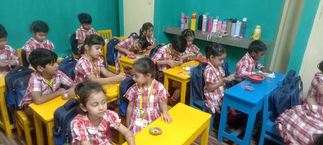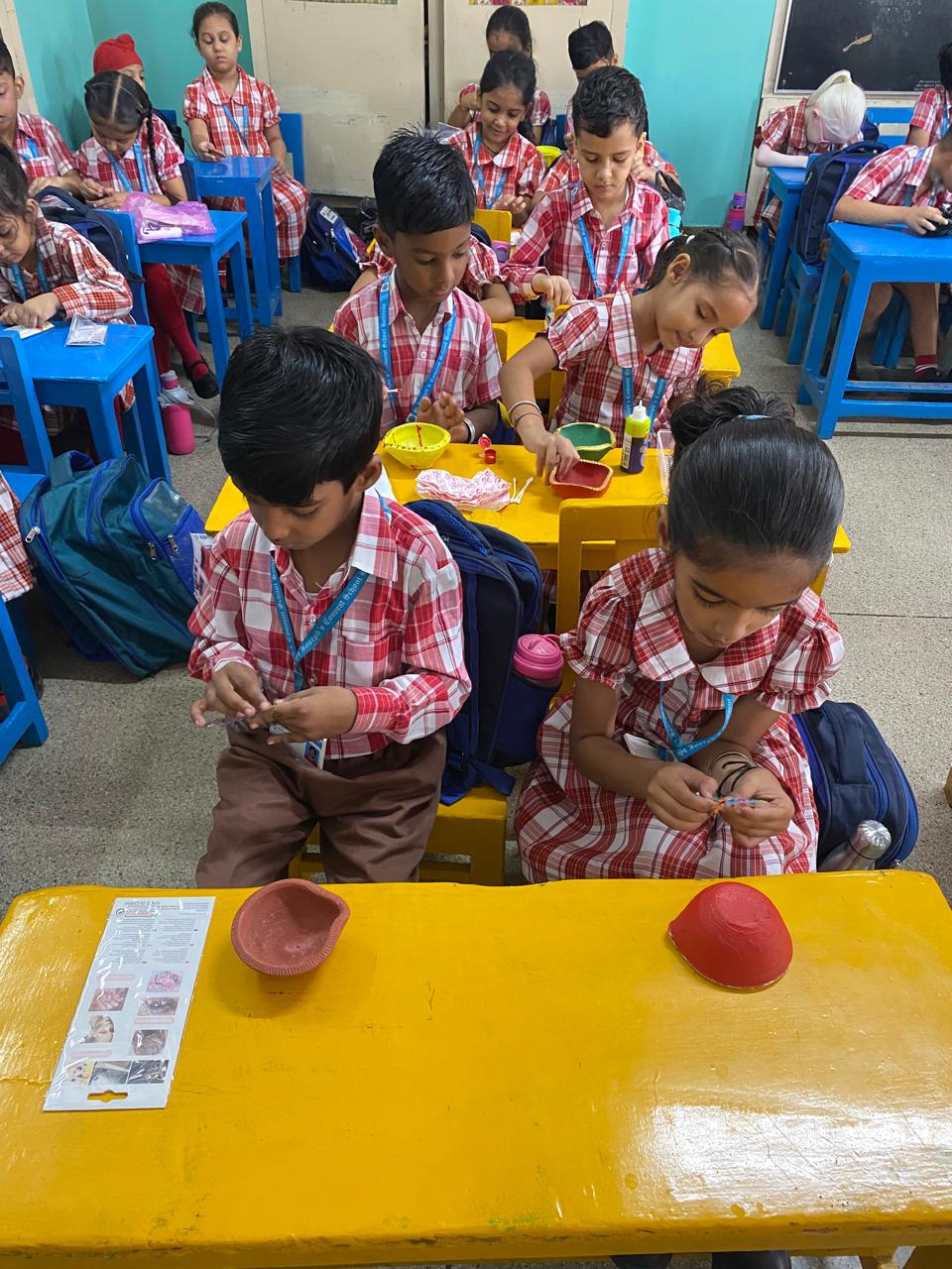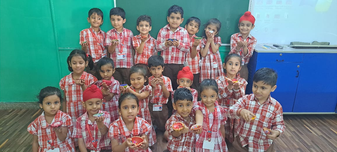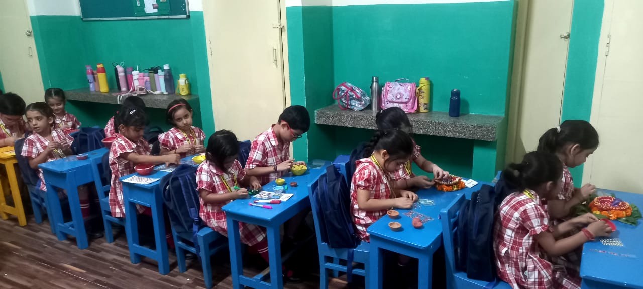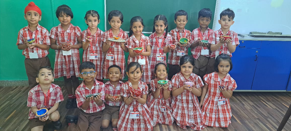 Diya Making Activity for Diwali was held for Class UKG on 8 Oct 2025. All the children were very happy and excited as they painted diyas with colors and added glitter and stickers. The diyas looked very beautiful!Teachers told students that diyas bring light and happiness to our homes & life. It was a fun filled and colorful day!