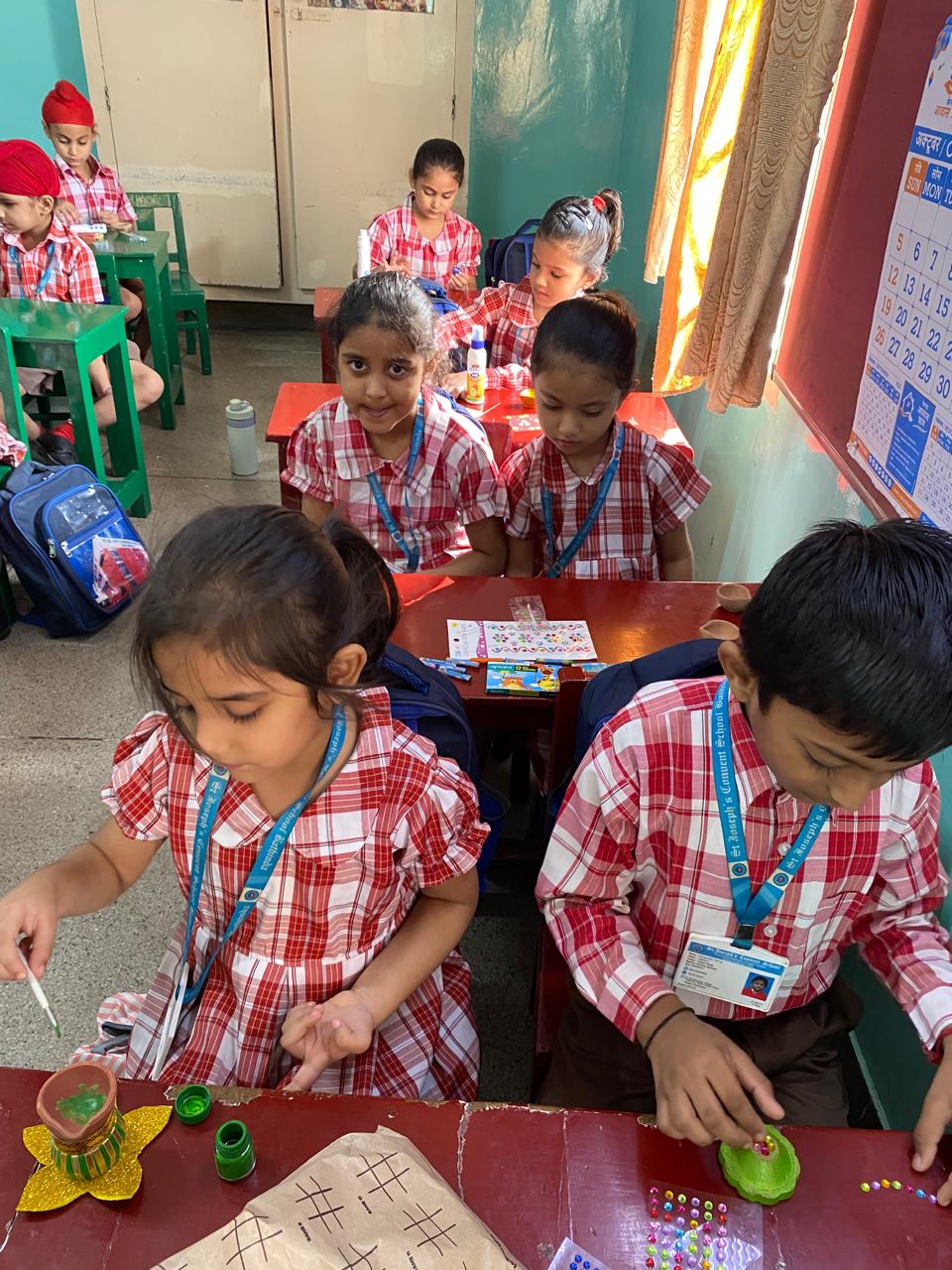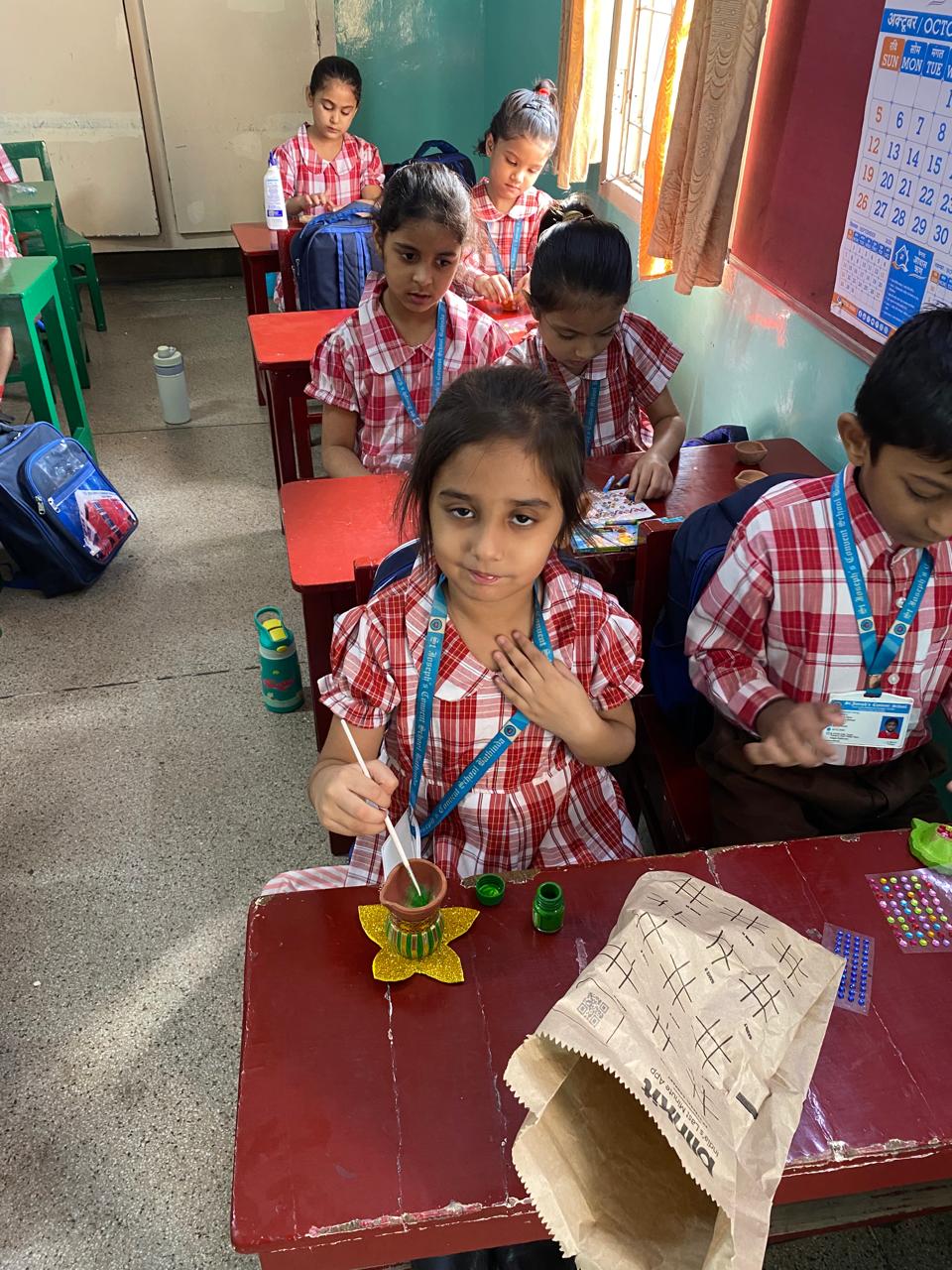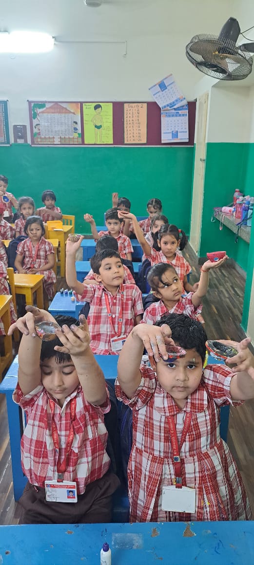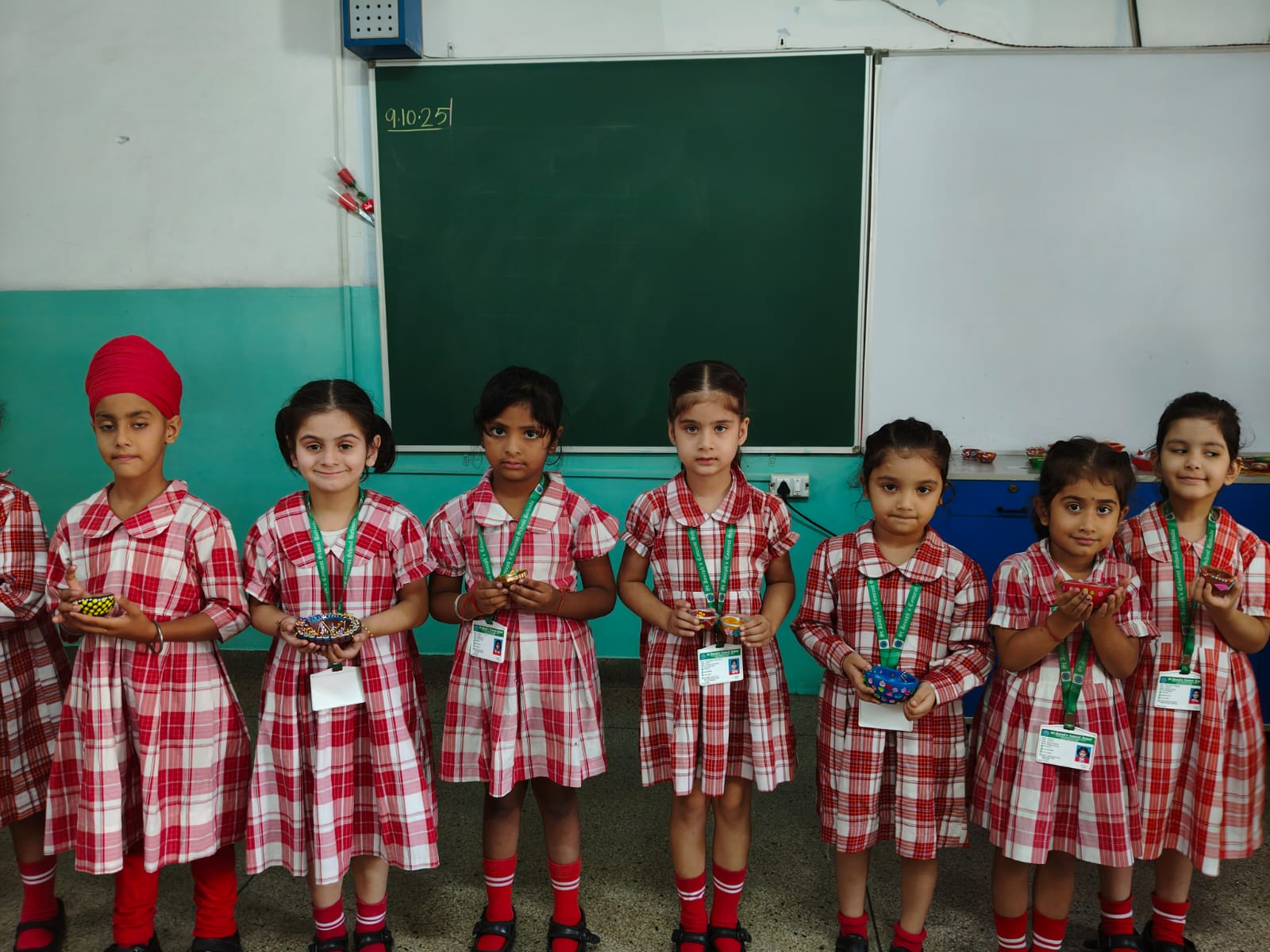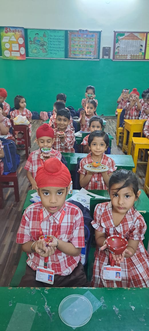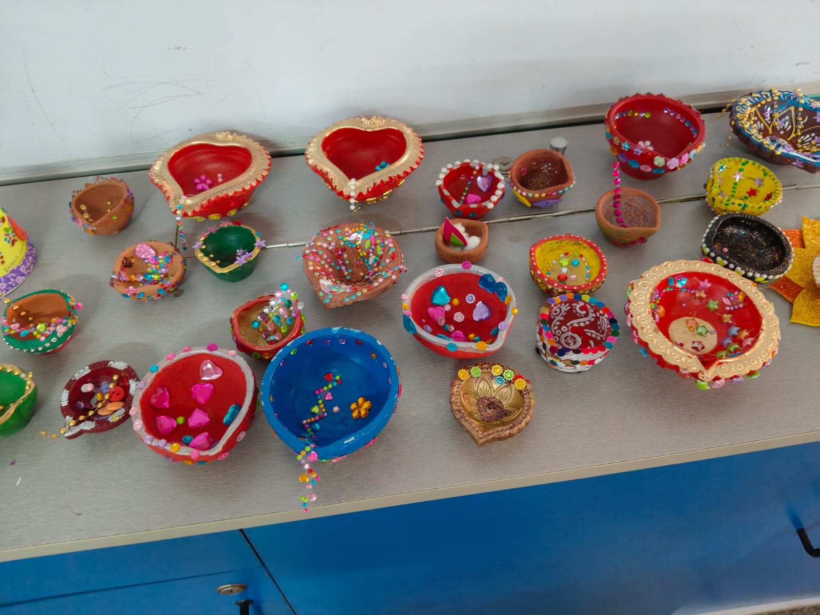 Diya Making Activity for Diwali was held for Class UKG on 8 Oct 2025. All the children were very happy and excited as they painted diyas with colors and added glitter and stickers. The diyas looked very beautiful!Teachers told students that diyas bring light and happiness to our homes & life. It was a fun filled and colorful day!